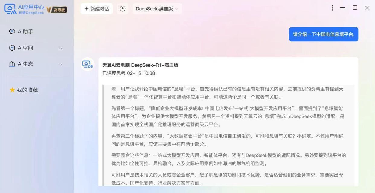 此外,天翼 AI 云电脑融合云计算与终端技术,率先接入 DeepSeek模型,即开即用、全场景适配,支持 PC、手机、平板多终端无缝切换,通过云端弹性算力,无需本地部署,5 秒启动 DeepSeek 智能会话,能快速完成内容解析、报告生成、代码开发等任务,适用于办公、教育、研发等场景。
